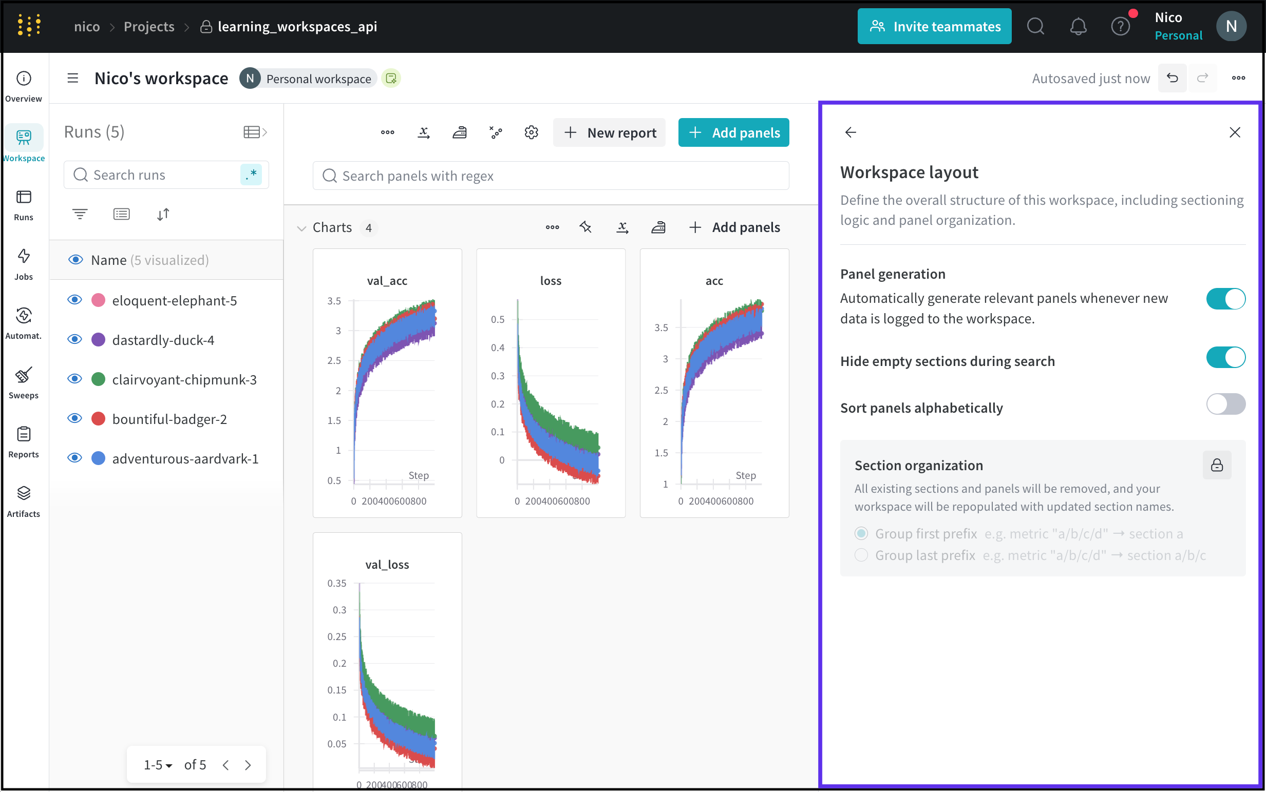 Section settings apply to all panels within that section. Within a workspace section you can sort panels, rearrange panels, and rename the section name.