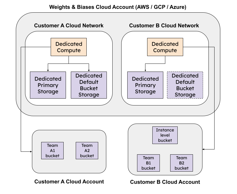 W&B Dedicated Cloud is a single-tenant, fully managed platform deployed in W&B’s AWS, GCP or Azure cloud accounts. Each Dedicated Cloud instance has its own isolated network, compute and storage from other W&B Dedicated Cloud instances. Your W&B specific metadata and data is stored in an isolated cloud storage and is processed using isolated cloud compute services.