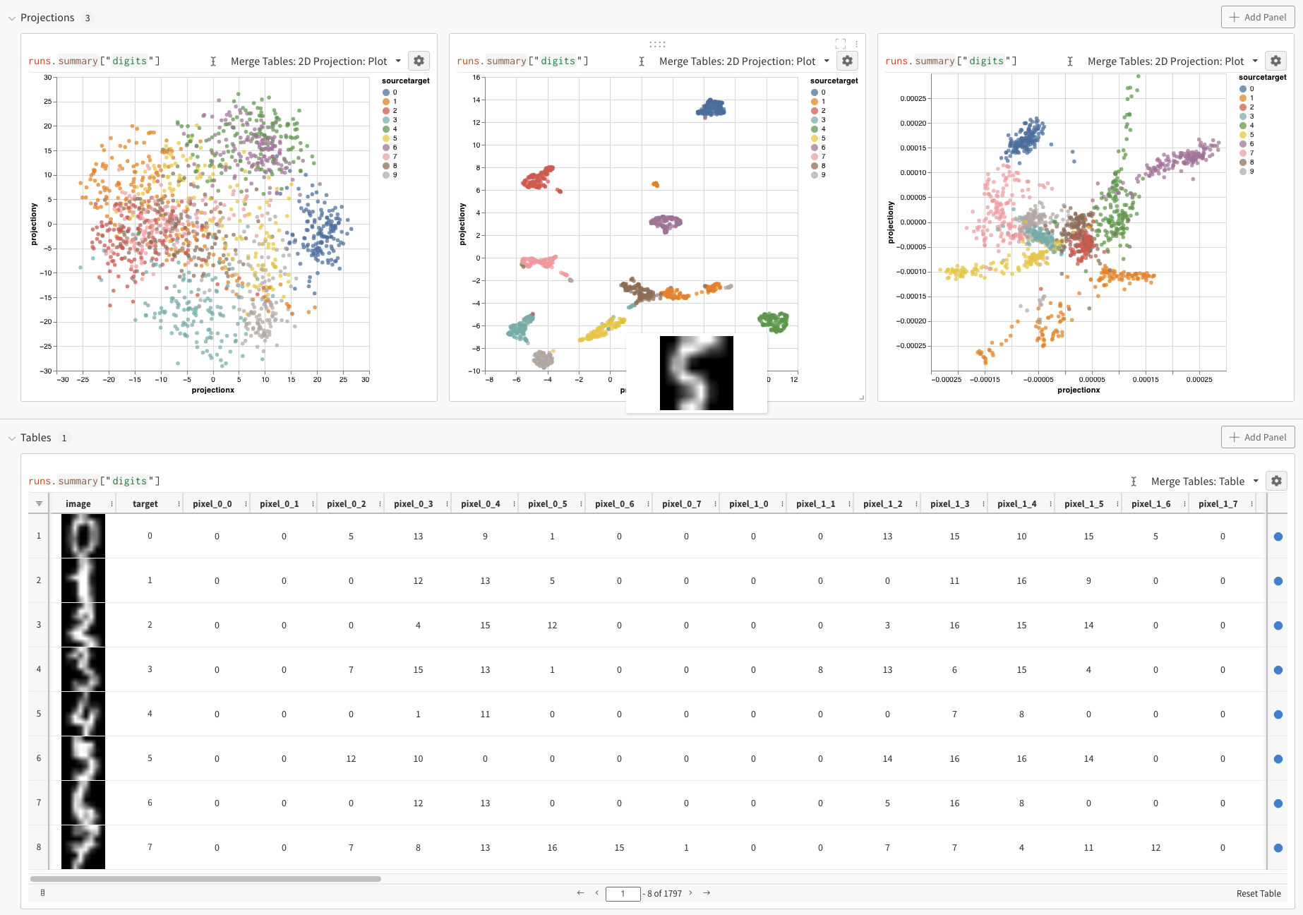 上記のコードを実行した後、再びUIにTableが表示されます。2D Projection を選択すると、Embeddingの定義、カラーリング、アルゴリズム(PCA、UMAP、t-SNE)、アルゴリズムのパラメータ、およびオーバーレイ(この場合、点にホバーしたときに画像が表示されます)の設定ができます。この特定のケースでは、すべて「スマートデフォルト」であり、2D Projection をワンクリックするだけで非常に類似したものを見ることができるはずです。この例を使ってインタラクティブにクリックします。